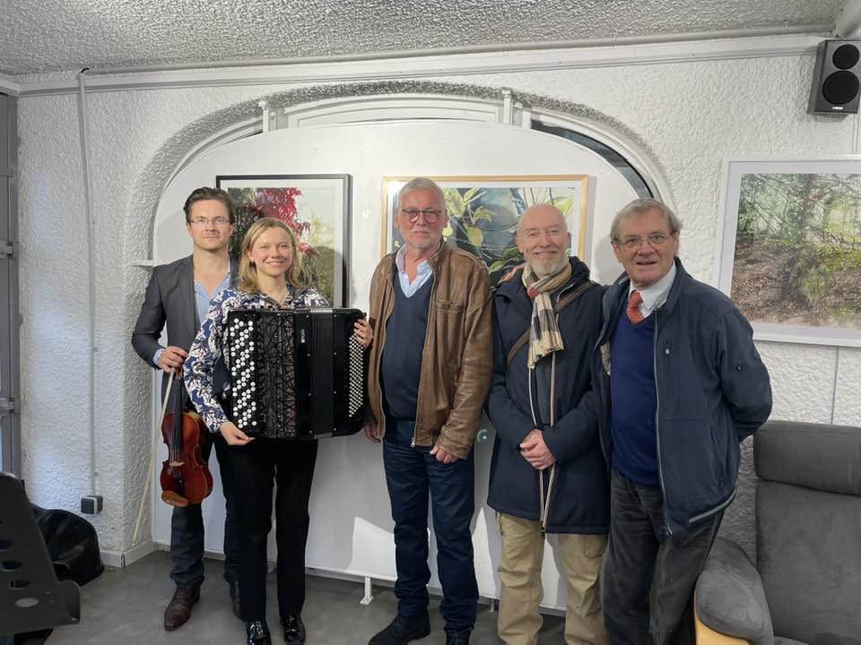 Jour de vernissage au passage des arts d’Evreux Navarre organisé par l’association Evreux 2044. De gauche à droite FlorentCouaillac violoniste, Émilie Delapierre accordéoniste, François Kunzé peintre aquarelliste, Pierre Allard artiste peintre, Georges Ferro-Lagree artiste peintre toutes générations confondues.